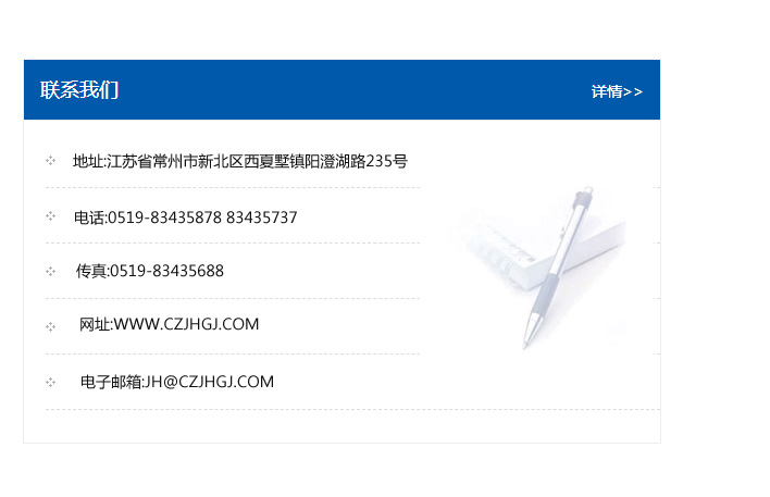 地址:常州市新北區友邦商務大廈1幢16、17層  電話:0519-85101652  傳真:0519-85112595  郵編:213022  網址:www_cz-jiayue_cn.sngci.com  郵箱:xiajifengaa@163.com